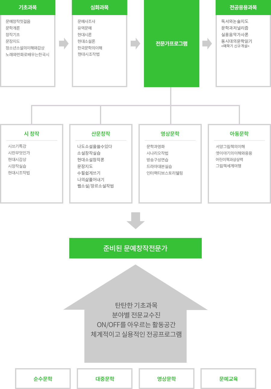 - 기초과목 : 문예창작첫걸음, 문학개론, 창작기초, 문장지도, 삶과표현, 청소년소설의이해와감상, 노래와 만화로 배우는 한국시